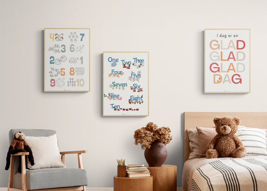 Plakater til børn er en oplagt mulighed for at kombinere leg og læring. Med vores forskellige plakater kan I øve både tal, bogstaver og dyrernes navn - både på dansk, engelsk, fransk og tysk. Det er en både sjov og spændende måde for børnene at lære nyt, sammen med dig.